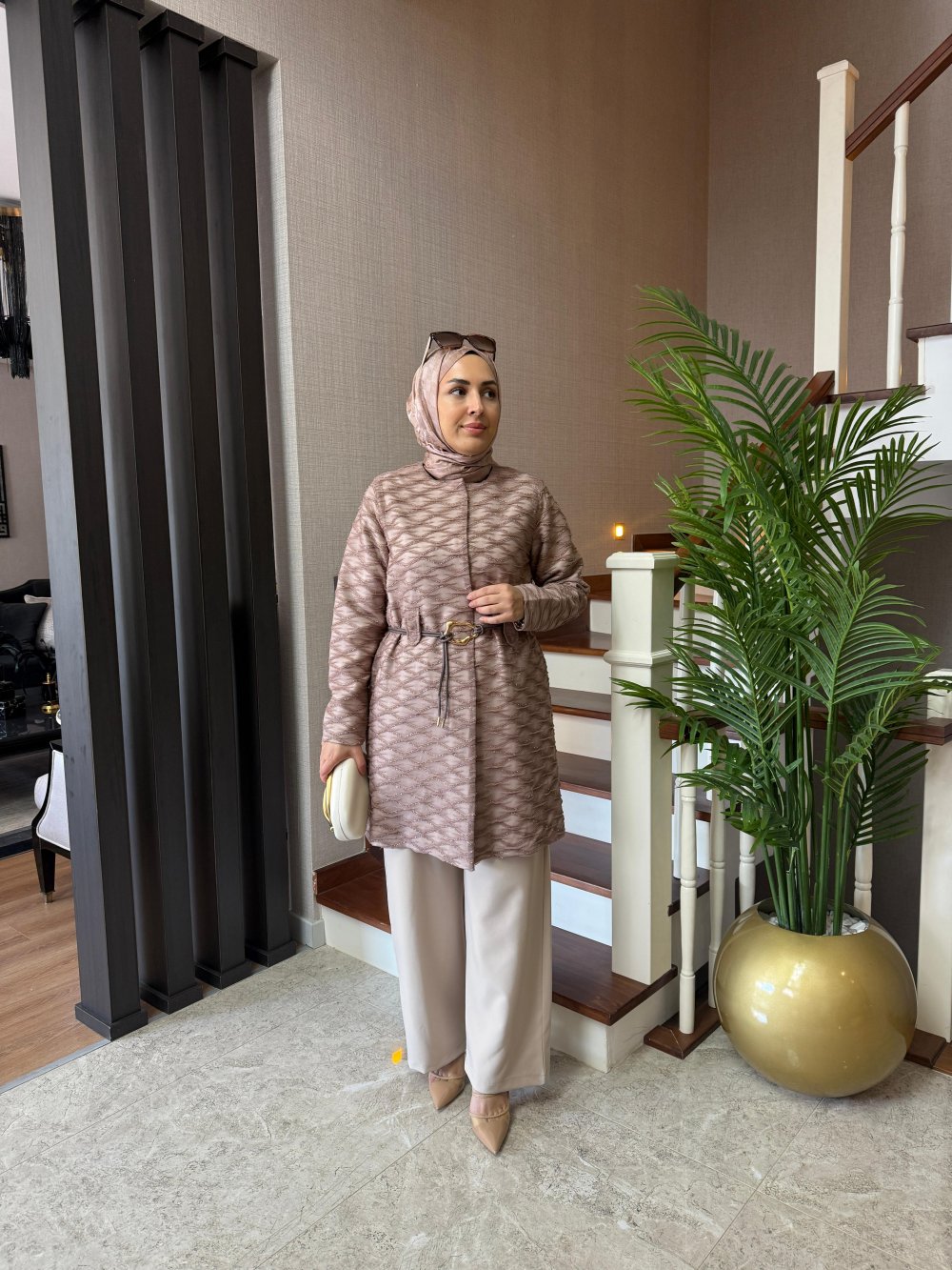 Ceket tül işleme detaylıdır, boy uzunluğu 85 cm’dir. Seyyar deri gold tokalı kemeri bulunmaktadır.