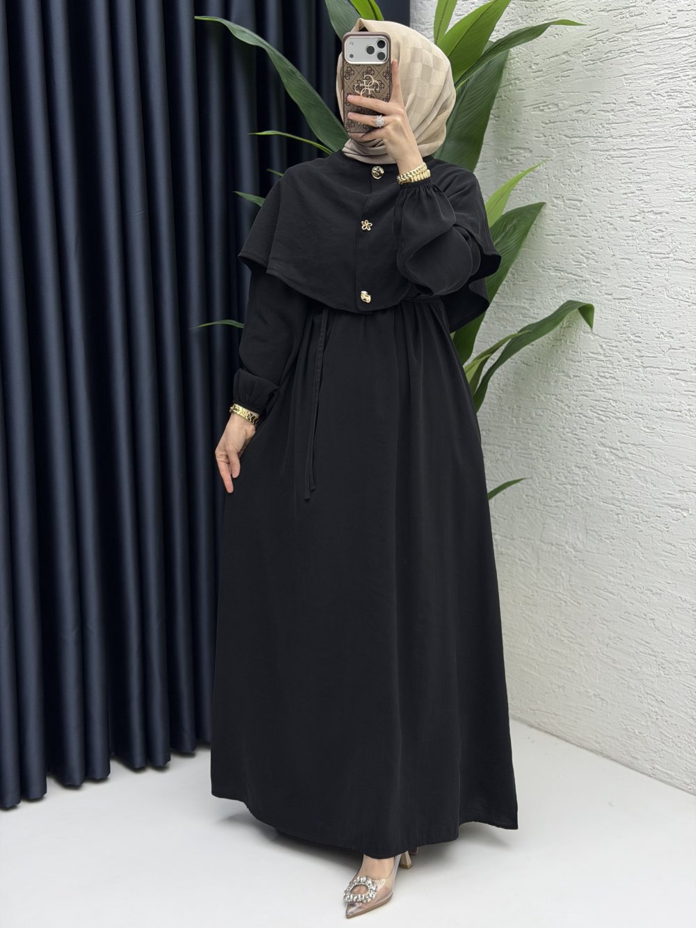 2 farklı model olarak kullanabileceğiniz pelerin detaylı elbisemiz