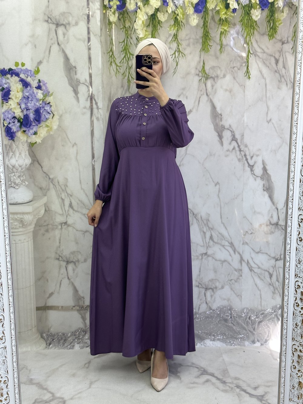 Feryal yaka boncuklu elbise Mor