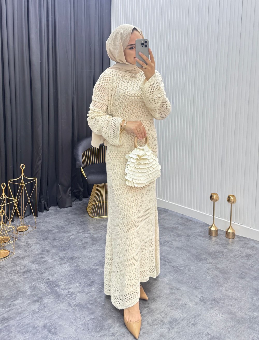 Boydan ajur file dataylı triko elbise salaş modeldir. ( Astarsızdır.)