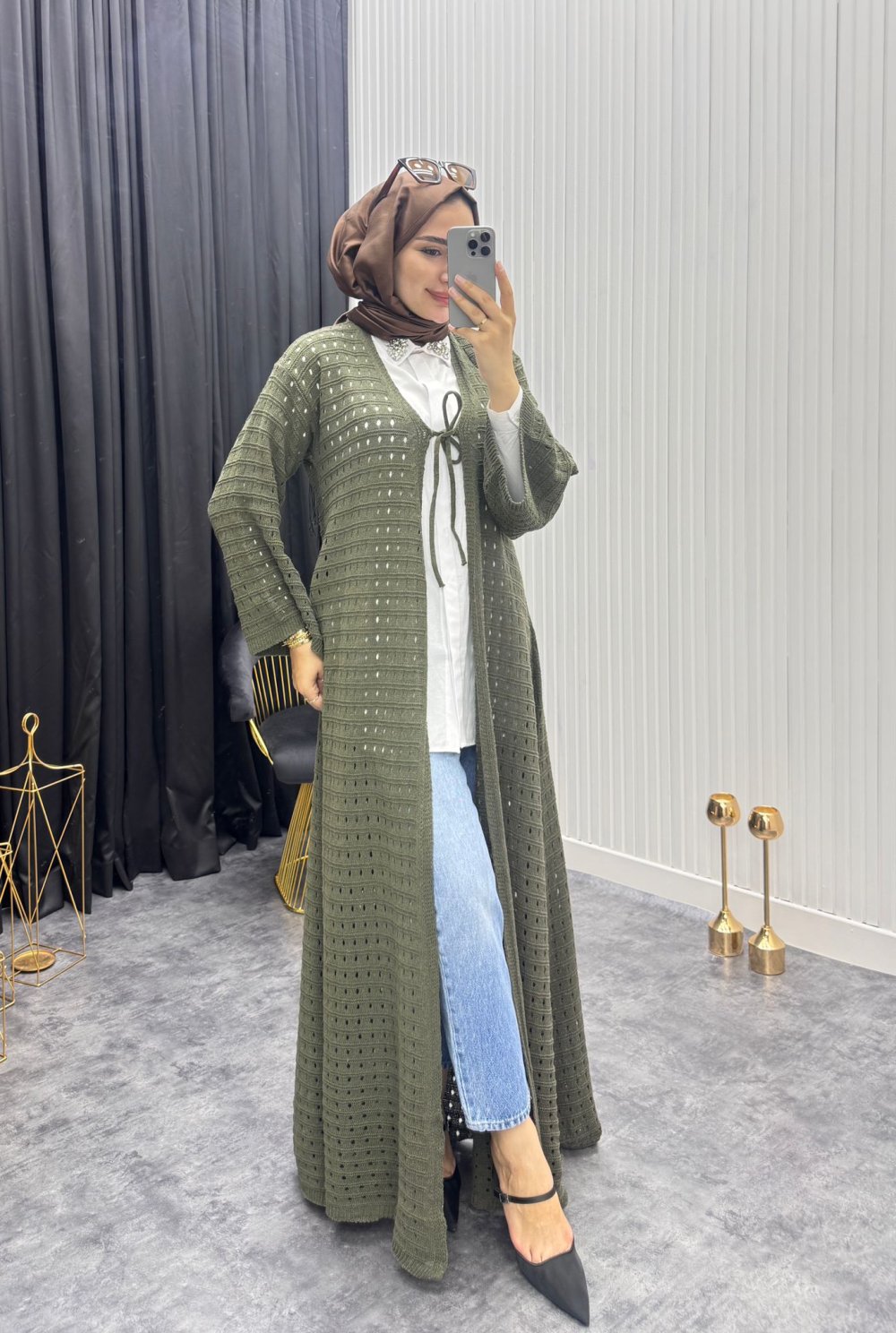 Boydan delik file detaylı önden kendinden ip bağcıklı kolları salaş triko hırka