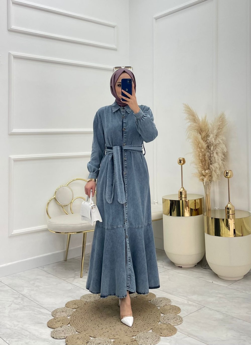 Ürünün Beden Aralığı ;36-38-40-42-44-46-48 Ürünün Kumaşı ;1. Sınıf yıkama kot kumaş Ürünün Boyu;135/140 cm önden düğmeli belden kemerli