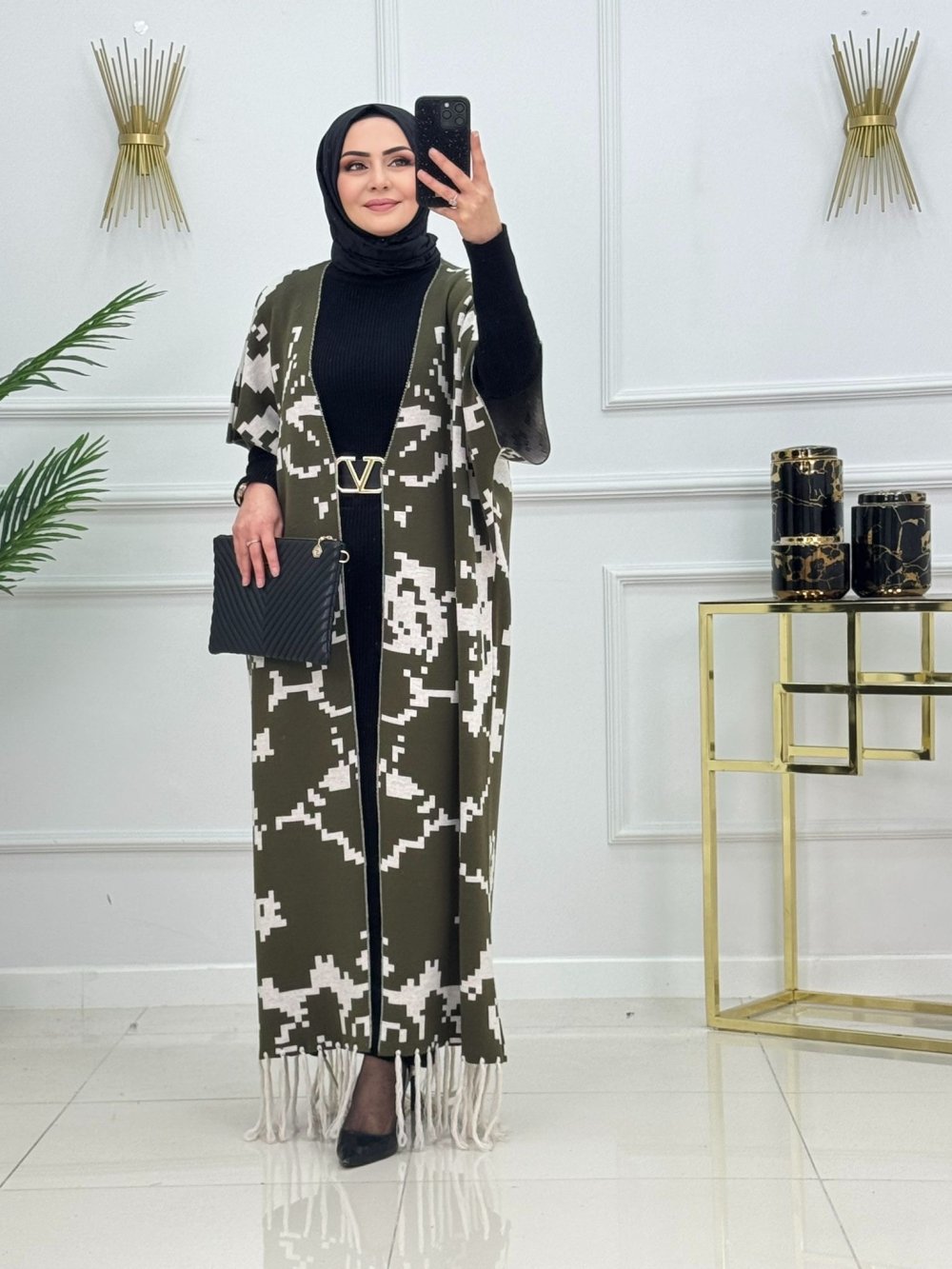 ?Ürün uzun kollu triko elbise ve kimono yelek olarak iki parçadan oluşmaktadır