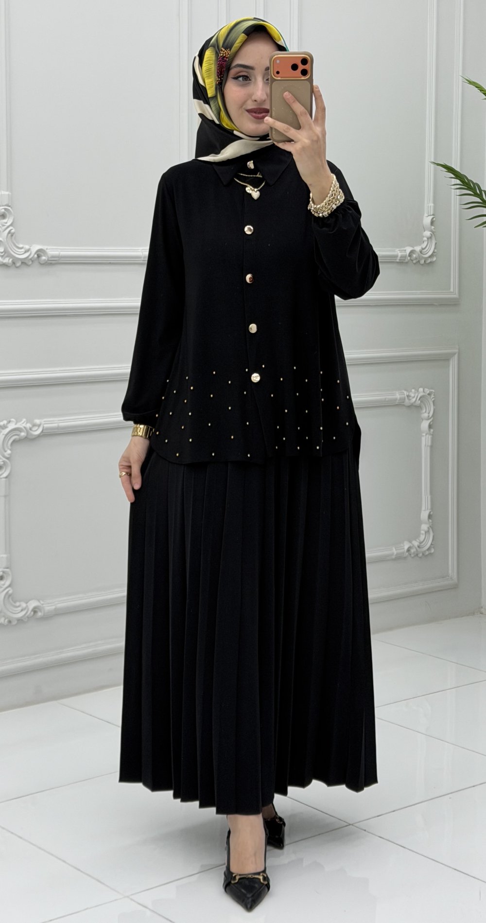 Hesna Etek Takım,hem iş hem de günlük hayatınızda rahatlıkla tercih edebileceğiniz çok yönlü bir parçadır. Şıklığı konforla buluşturan bu tasarım, sezonun en gözde modellerinden biri olacak