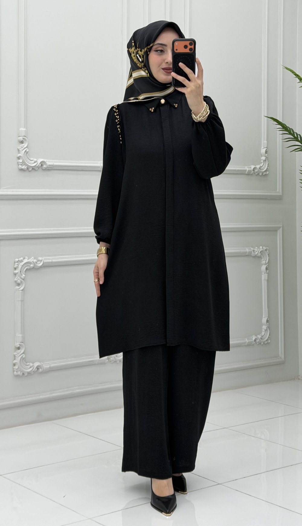 Işıltı  Takım, hem iş hem de günlük hayatınızda rahatlıkla tercih edebileceğiniz çok yönlü bir parçadır. Şıklığı konforla buluşturan bu tasarım, sezonun en gözde modellerinden biri olacak!