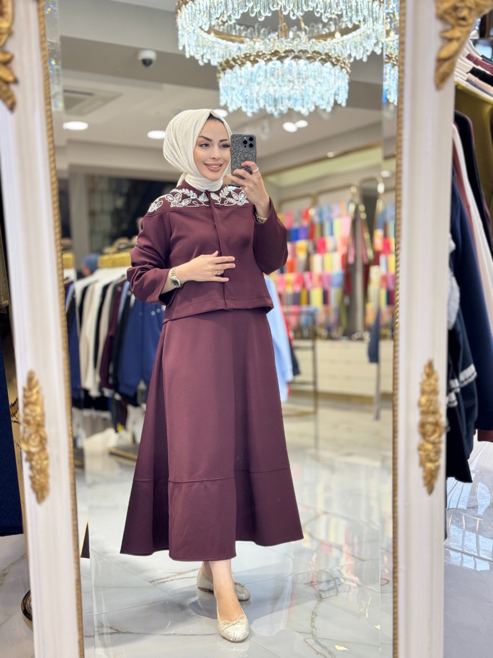 K6007 Omuzları Boncuk İşlemeli Etekli Takım Bordo