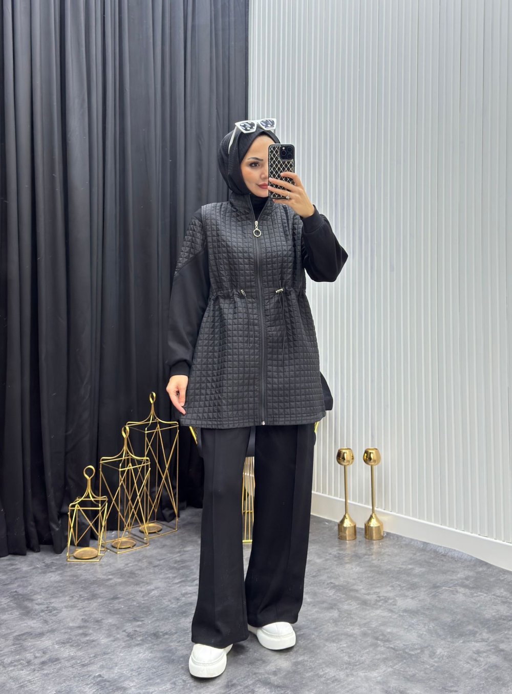 takım 3 parçadan oluşmaktadır yelek boydan fermuarlı belden ayarlamalıdır pantolon beli lastiklidir