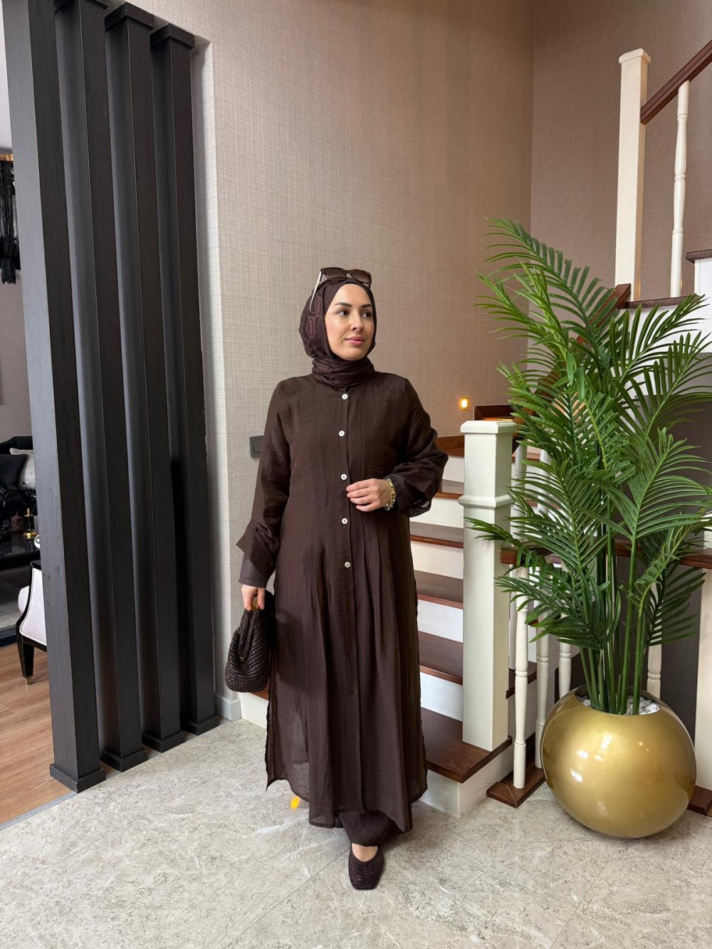 Tunik boy 125 cm’dir. Önü nervürlüdür, sedef düğme detaylıdır.