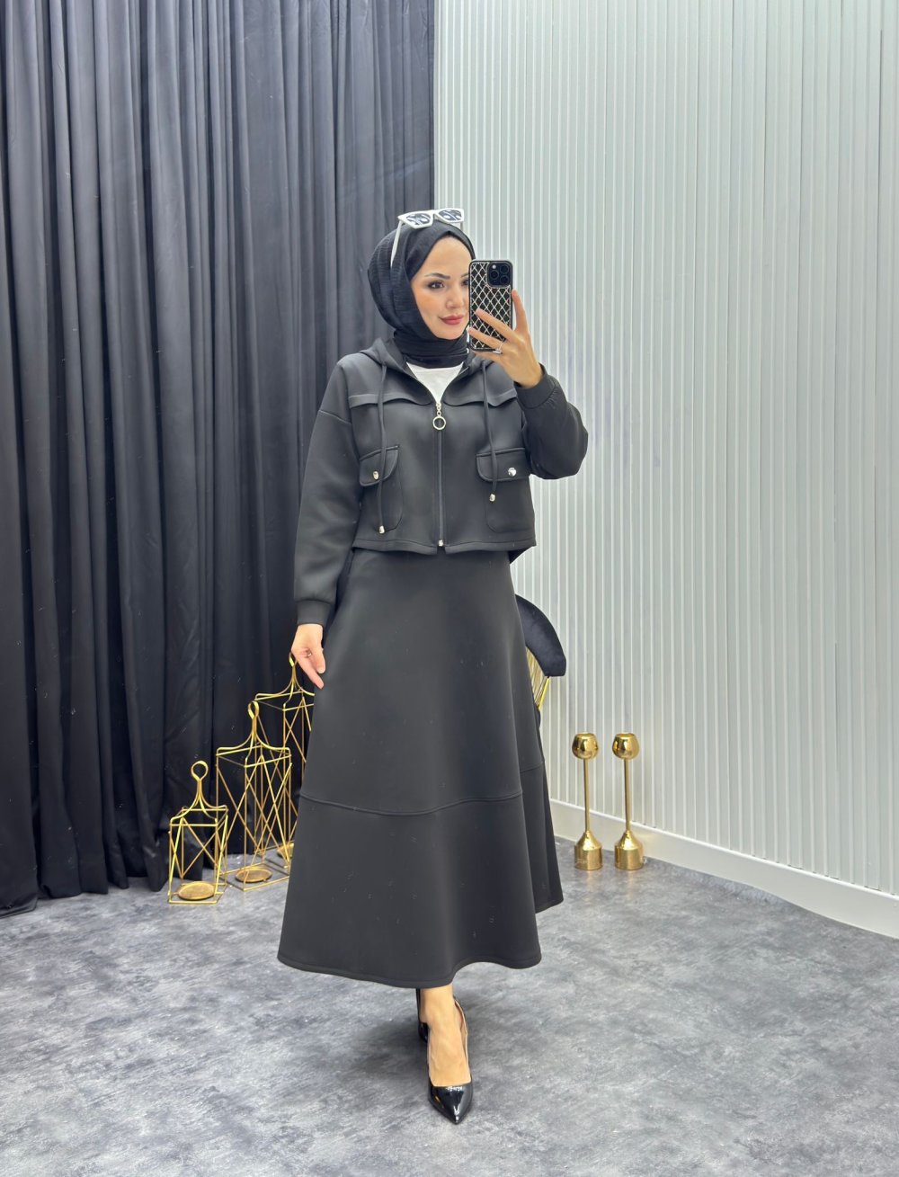 Crop ceket ve etek olmak üzere iki parçadan oluşmkatadır.