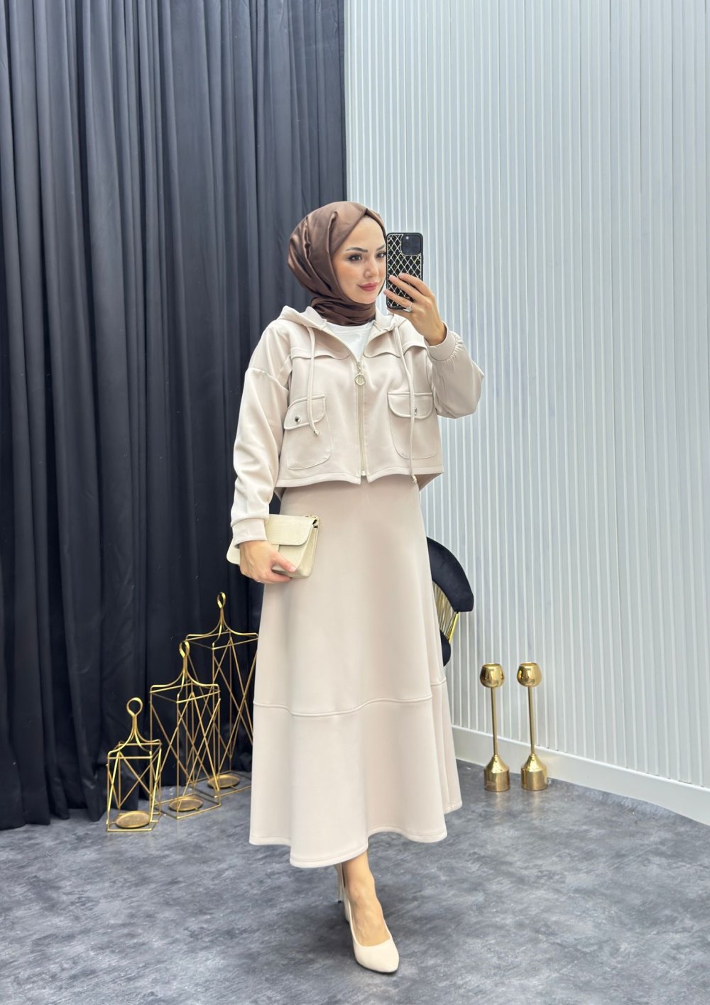 Crop ceket ve etek olmak üzere iki parçadan oluşmkatadır.