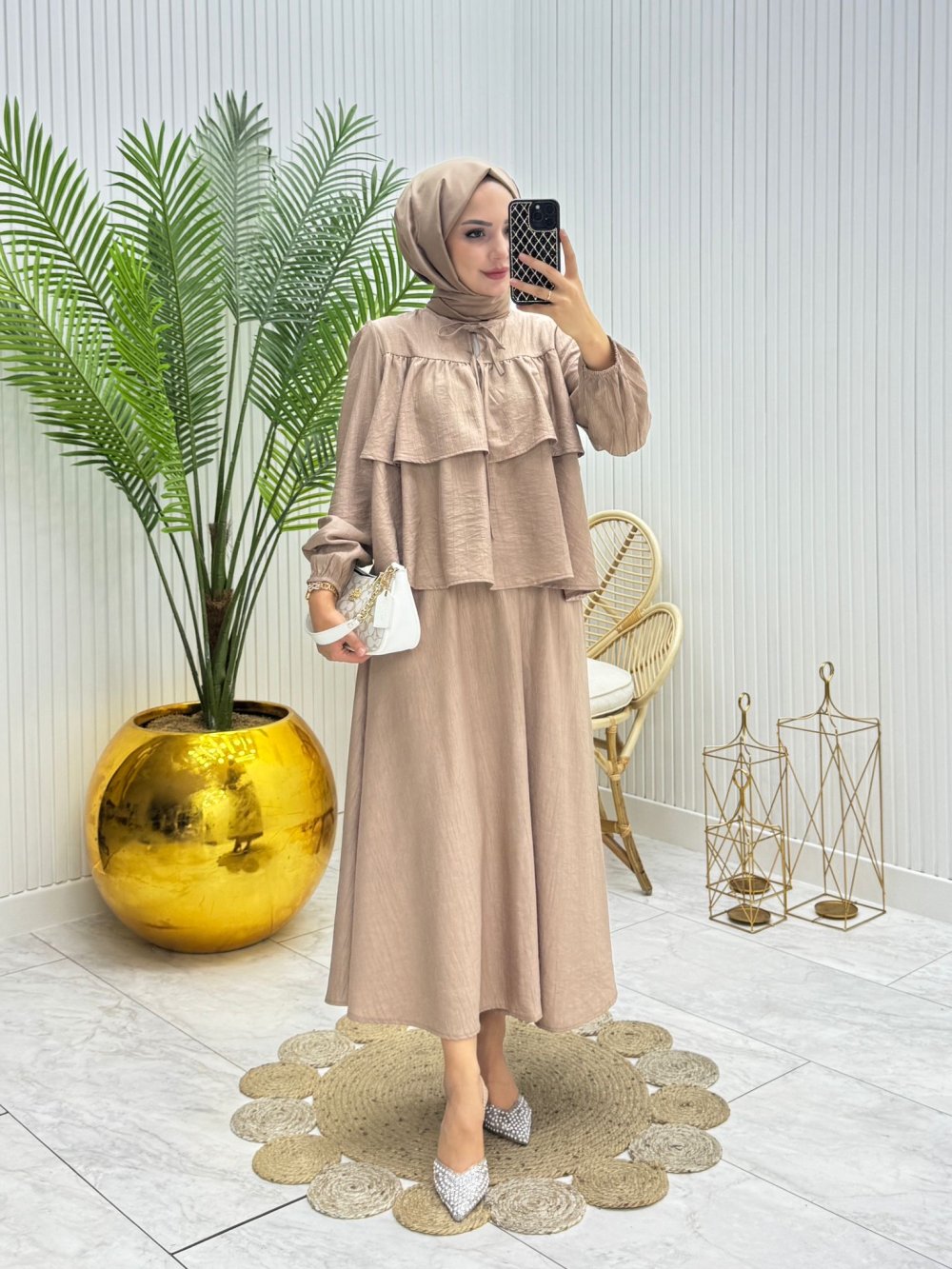 Kombinimiz kimono etek olmak üzere iki parçadan oluşmaktadır. Tunik kat kat önden ip bağcık detaylı etek belden lastikli kol manşetleri lastikli ikili tesettür takım