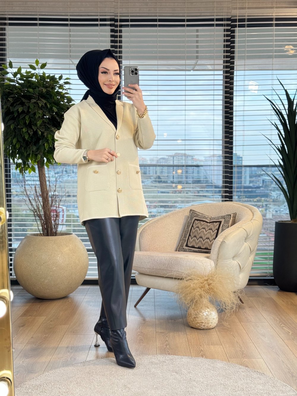 MRW1156 Metal Düğmeli Yakalı Hırka Bej