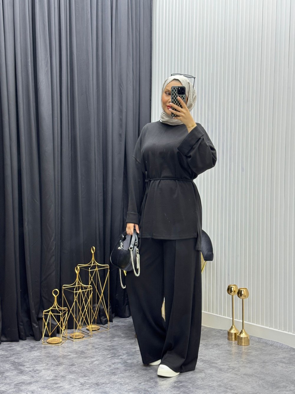 Yeni sezon kolu katlama detaylı ,seyyar kuşaklı ve pantolon beli lastiklidir. Tuniğimizin önü kısa arkası uzundur