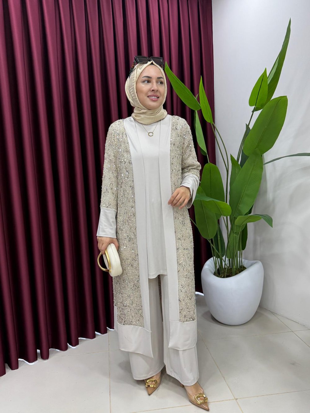 Dış kap payetlidir, boy uzunluğu 120 cm’dir.
