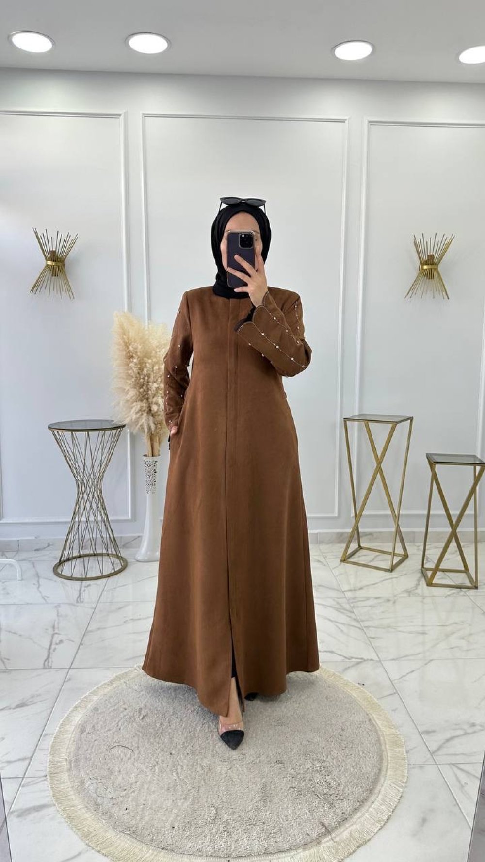NUBUK KUMAŞ VE TAŞ DETAYLI SADE VE ŞIK FERACE MODELİMİZ