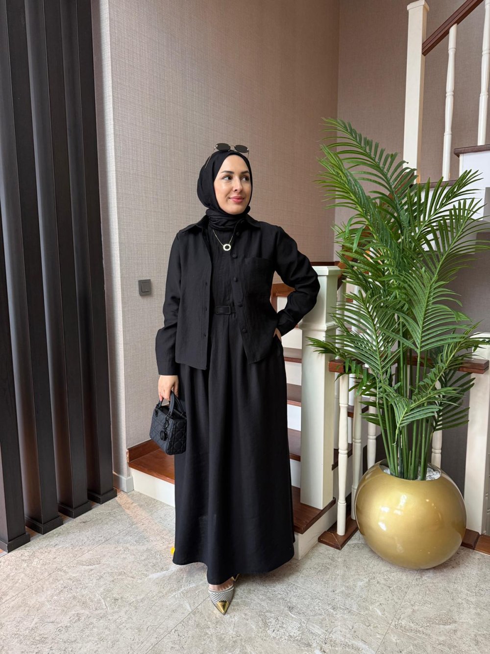 Elbise boy 138 cm’dir, sıfır kollu, arkadan fermuarlı, önünde nervür detayları bulunmaktadır ve kendinden kaplama kemeri mevcuttur.