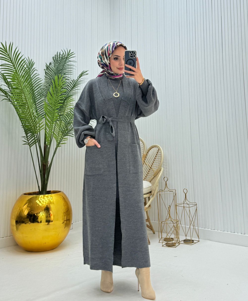 elbise ve hırkadan oluşmaktadır hırka yanlardan cepli kemerli