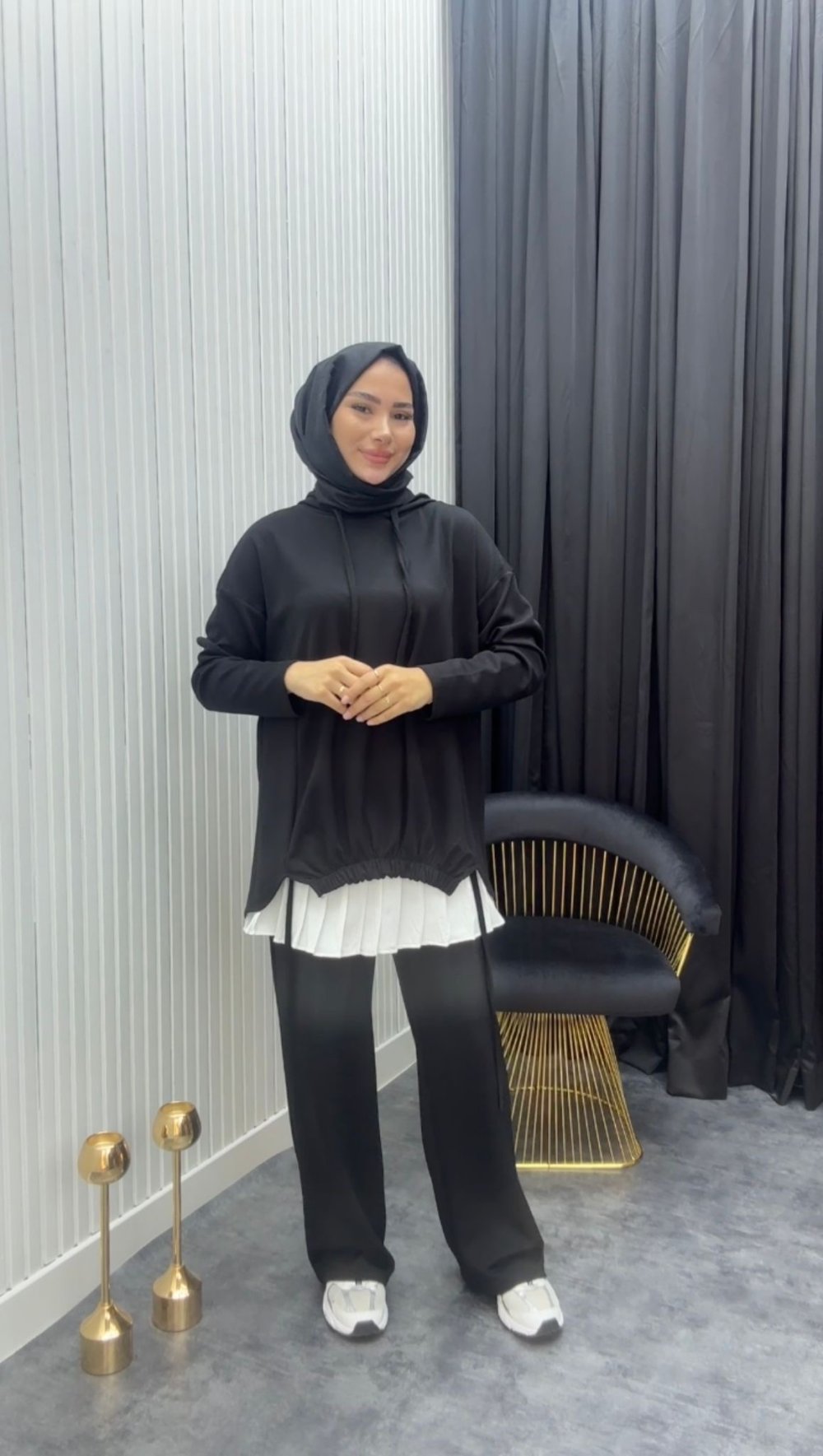 Ürün tunik ve pantolon olmak üzere iki parçadan oluşmaktadır. Tunik asimetrik kesim önden büzgü ve bağcık detaylıdır. kapüşonludur. Pantolon belden lastiklidir. Kombin de etek içlik kullanılmıştır. İçlik ürüne dahil değildir