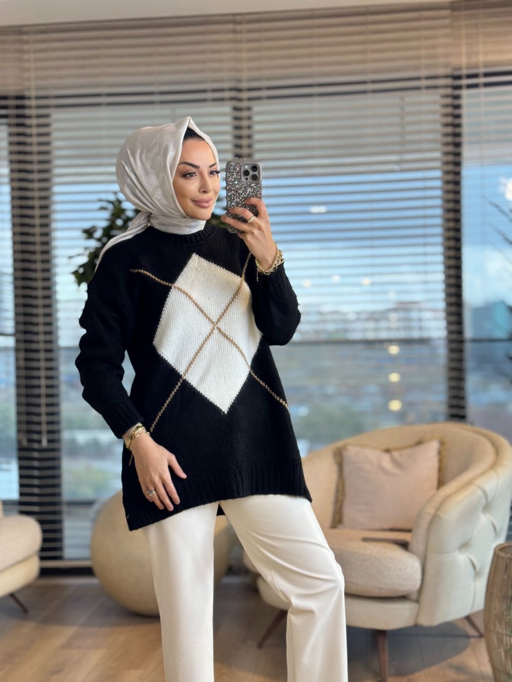 T8508 Önü Zikzak Desenli Triko Tunik Siyah