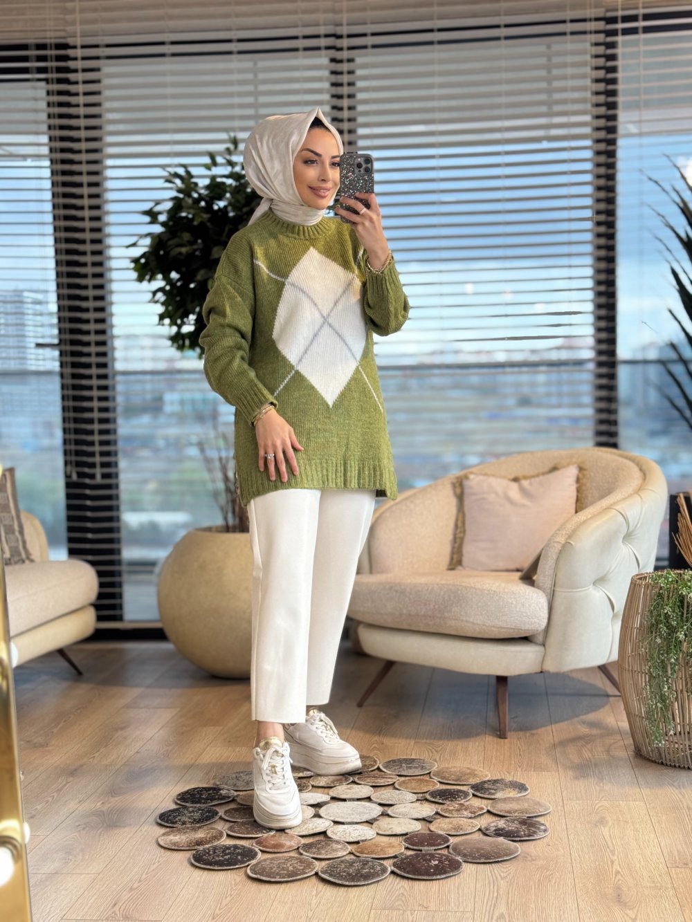 T8508 Önü Zikzak Desenli Triko Tunik Yeşil