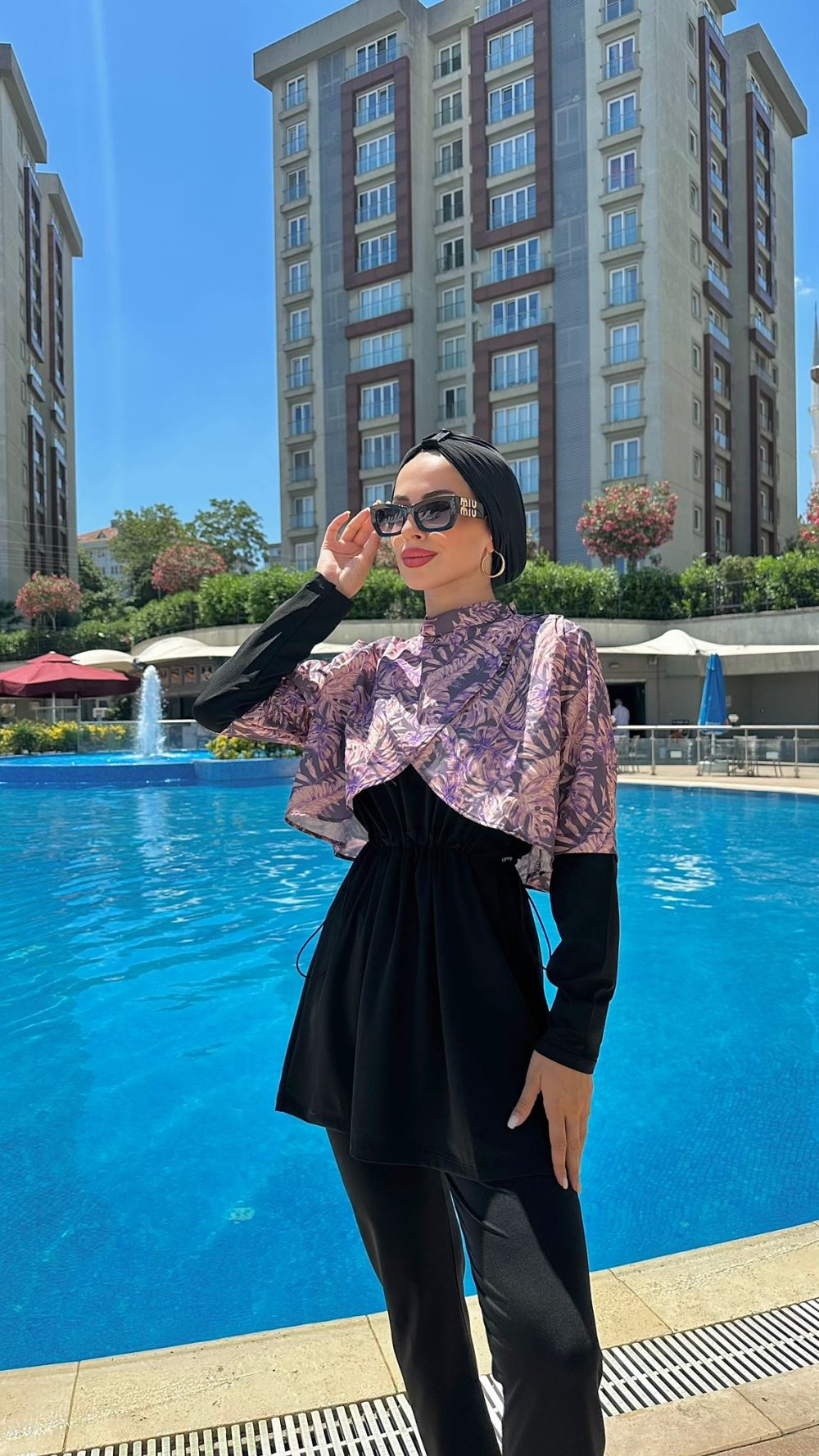 Desenli tunik hakim yaka önden yarım boy fermuarlıdır ve etek görünümü detaylıdır denizde havuzda açılma yapmaz iç göstermez pantolon belden lastiklidir tesettüre uygun üretilmiştir