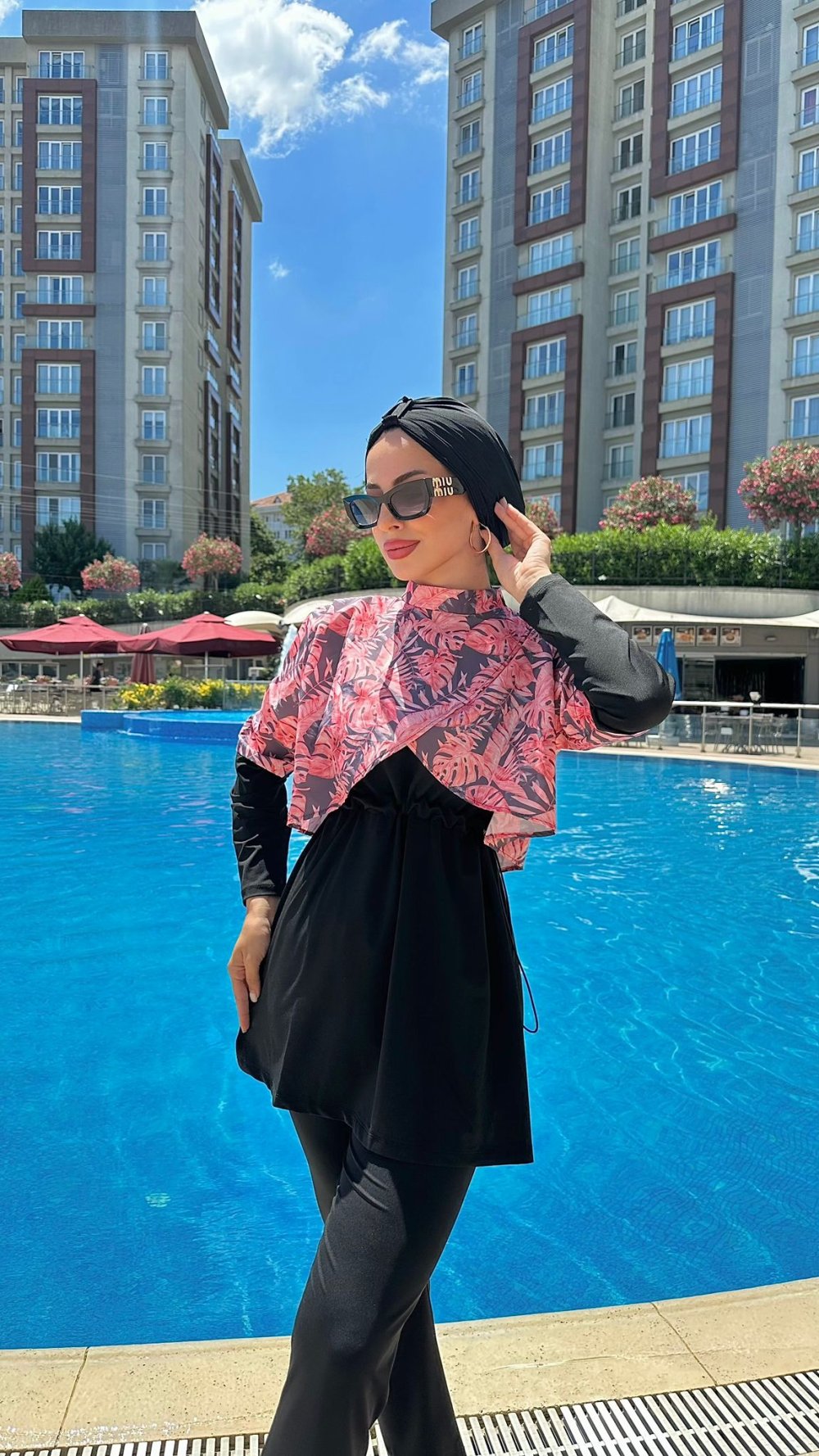 Desenli tunik hakim yaka önden yarım boy fermuarlıdır ve etek görünümü detaylıdır denizde havuzda açılma yapmaz iç göstermez pantolon belden lastiklidir tesettüre uygun üretilmiştir