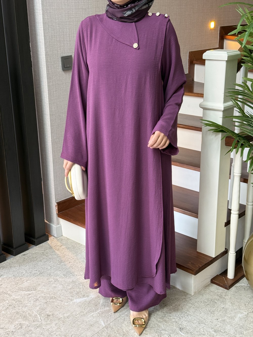 Tunik boy 125 cm’dir. Kruvaze kapama şeklinde gelmektedir, omuzunda düğme detayları mevcuttur.