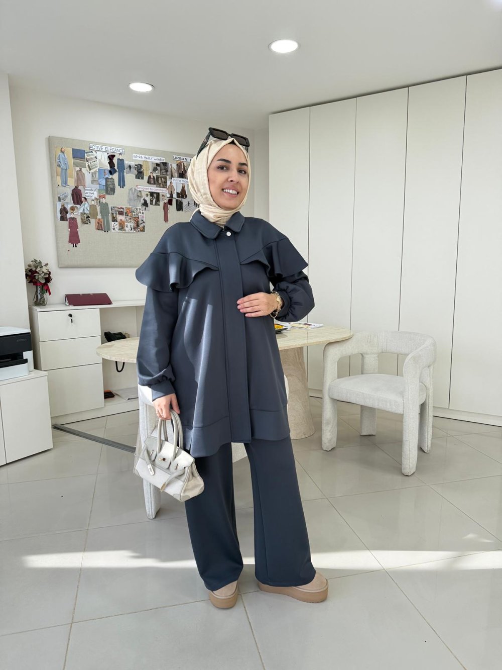 Tunik boy 85 cm’dir. Önden fermuarlı ve çıtçıt detayı mevcuttur.