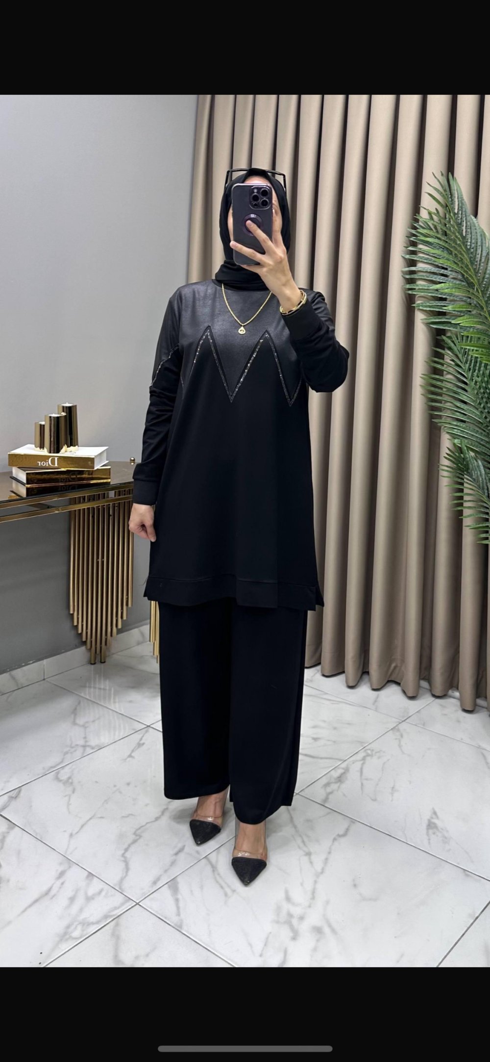 Zikzak Taş/Deri Detaylı Takım Siyah